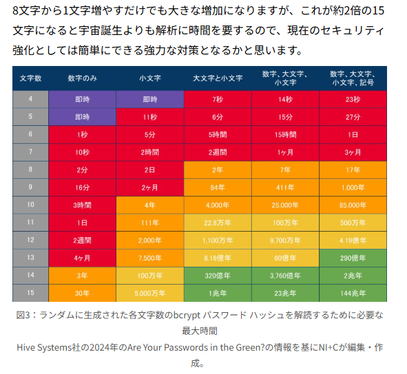 8ケタの比較を見ると、数字のみの場合は2分、小文字のみの場合は2日、大文字と小文字なら2年、数字と大文字と小文字なら7年、数字と大文字と小文字と記号で17年かかるというのが、参考サイトの図3「:ランダムに生成された各文字数のbcrypt パスワード ハッシュを解読するために必要な最大時間 Hive Systems社の2024年のAre Your Passwords in the Green?の情報を基にNI+Cが編集・作成。」です。